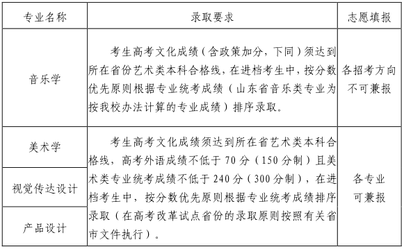 2022年我校艺术类各专业全部使用各省统考成绩录取(山东省音乐类专业为按我校办法计算的专业成绩),不再单独组织专业校考,具体录取要求如下。