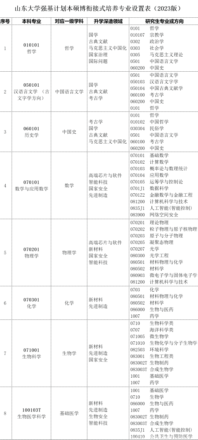 为深化新时代高考改革,培养基础学科拔尖创新人才,服务国家重大战略,根据教育部《关于在部分高校开展基础学科招生改革试点工作的意见》等文件精神,我校自2020年起开展基础学科招生改革试点(也称“山东大学强基计划”),选拔一批有志向、有兴趣、有天赋的青年学生进行本硕博衔接培养。为做好山东大学2023年强基计划招生工作,特制订本简章。