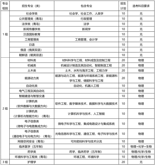 注1:考生只能报考其中一个组别的专业,最多可报6个专业志愿,并可选择是否服从专业调剂(同组内调剂);根据生源情况,各专业招生计划可适当调整;最终招生专业及计划以山东省教育招生考试院公布为准。